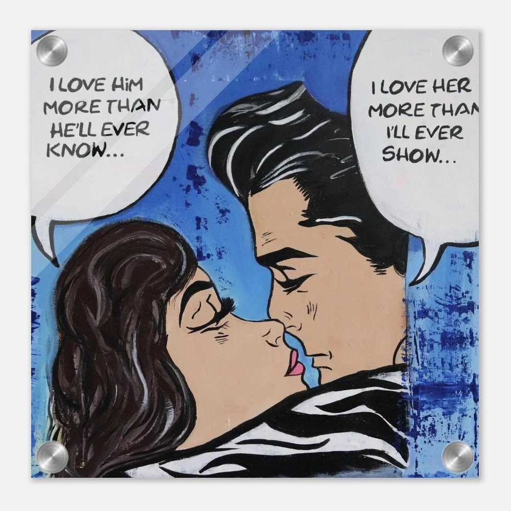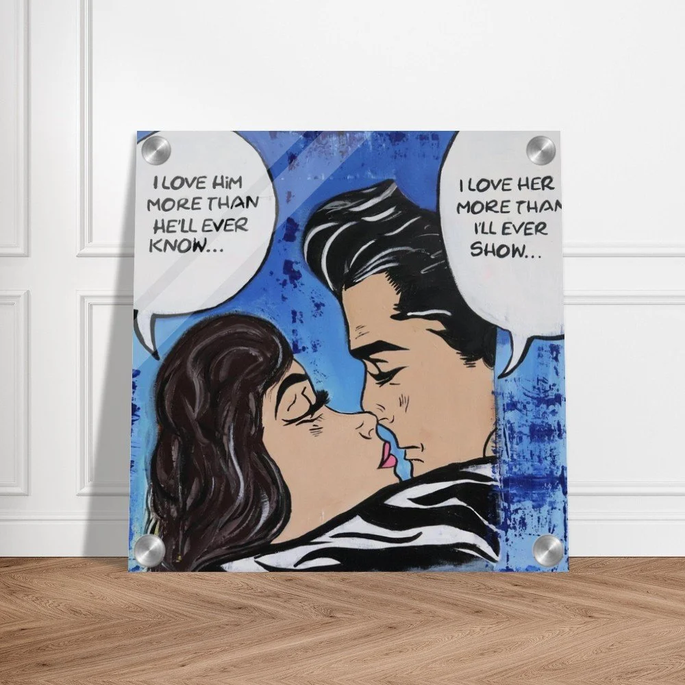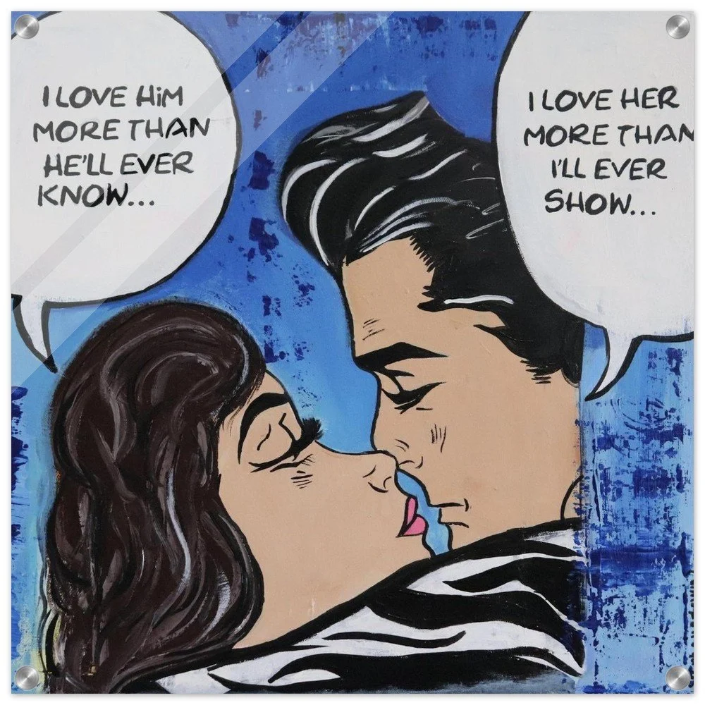 Original Acrylic by Stephanie Lewin: This piece is an original acrylic by Stephanie Lewin, artist and founder of Bent, Not Broken. Captured in a striking pop-art comic style, it explores the intricate dance of human connection and the silent depths of our emotions. In the light of Unity Consciousness, this work reminds us that while we often feel separate in our feelings, there is a shared Presence in the love we hold for one another, even when it remains unspoken.