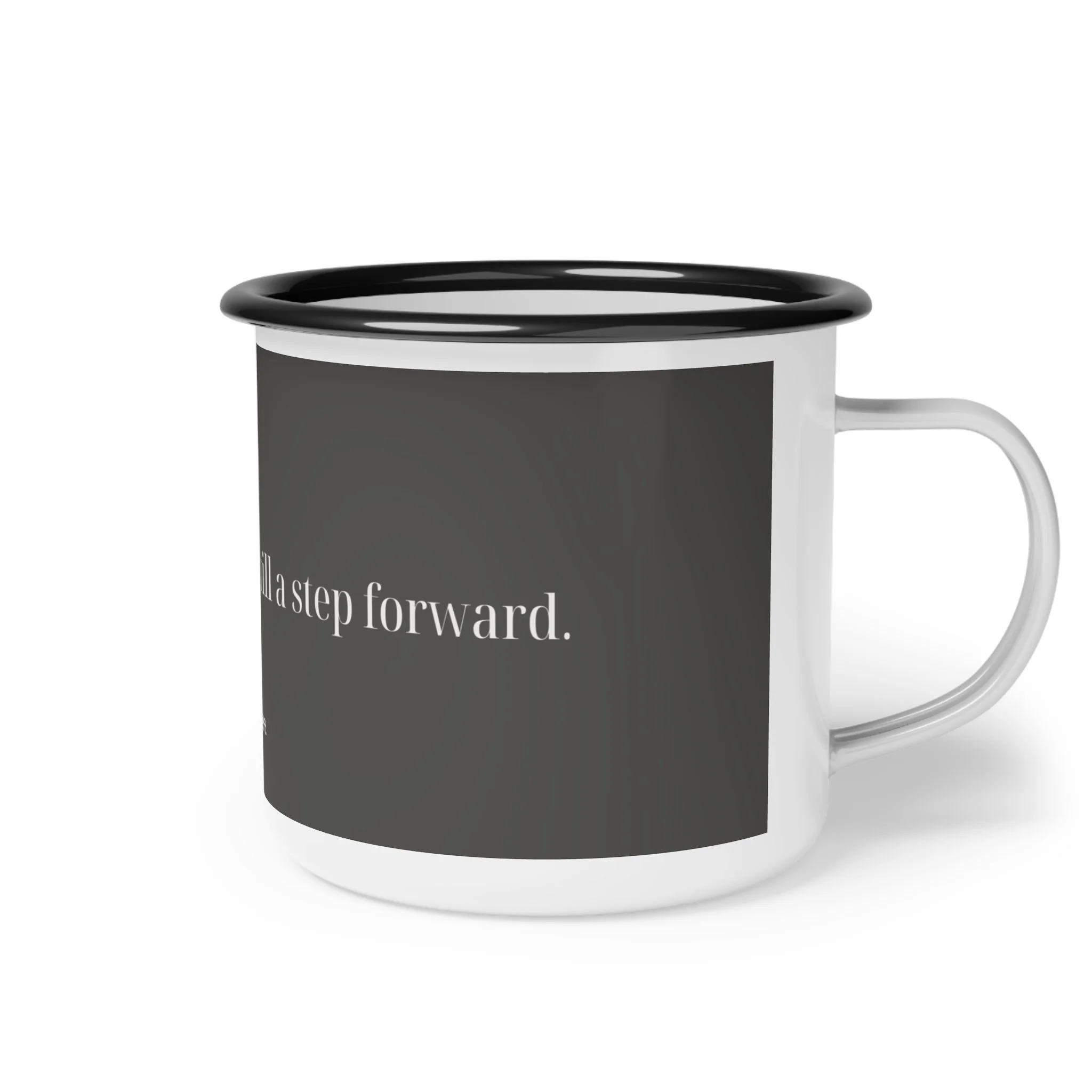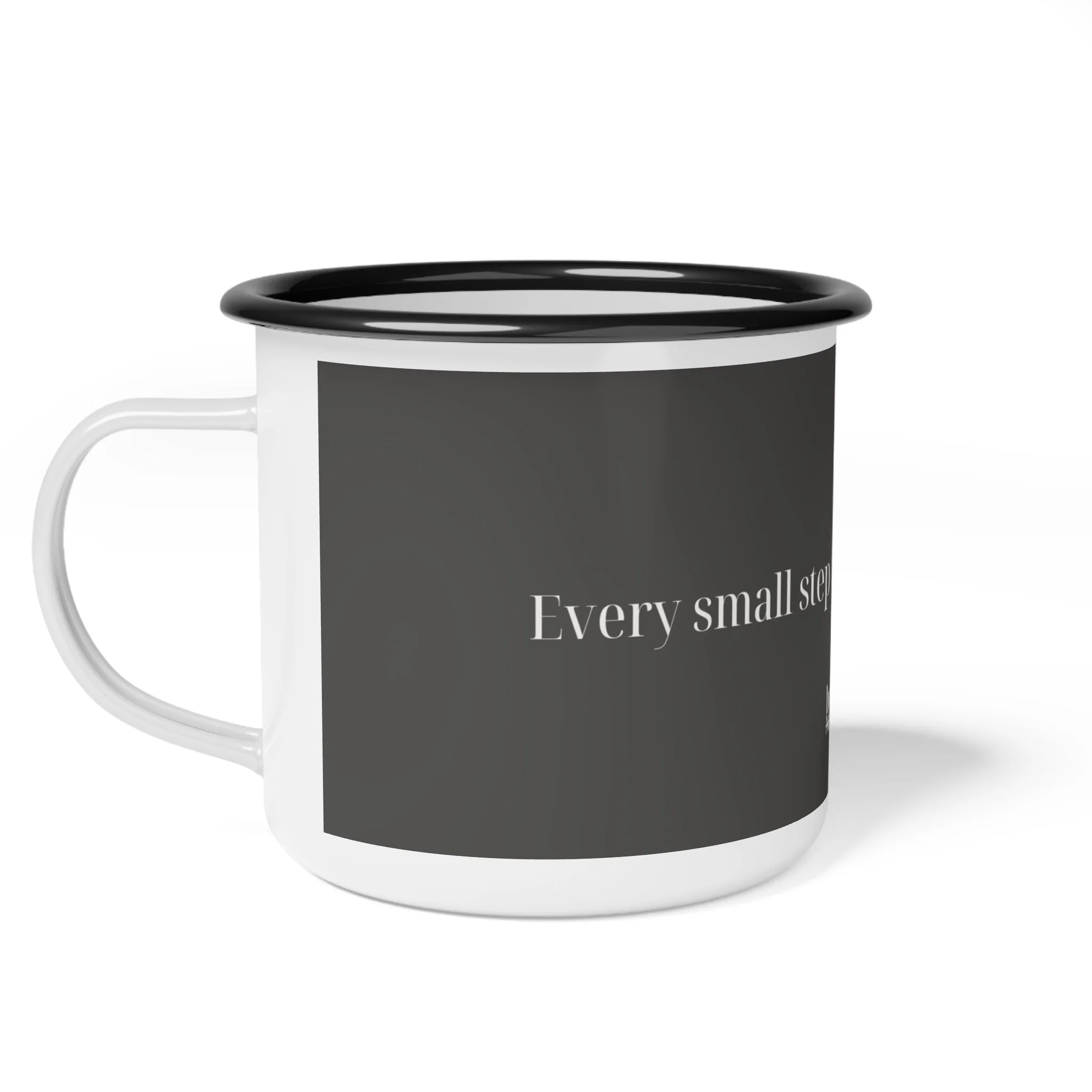 This enamel camp cup brings quiet encouragement to every outdoor morning and late-night conversation. With a soft charcoal wrap and a slim, serif message—“Every small step is still a step forward”—it feels like a friend on the trail: steady, understated, and real. The glossy white body and black rim give it classic enamel charm while the crisp print stands up to the wear of real adventures. Use it for coffee by the tent, tea at a picnic table, or as a small daily reminder on your kitchen shelf.