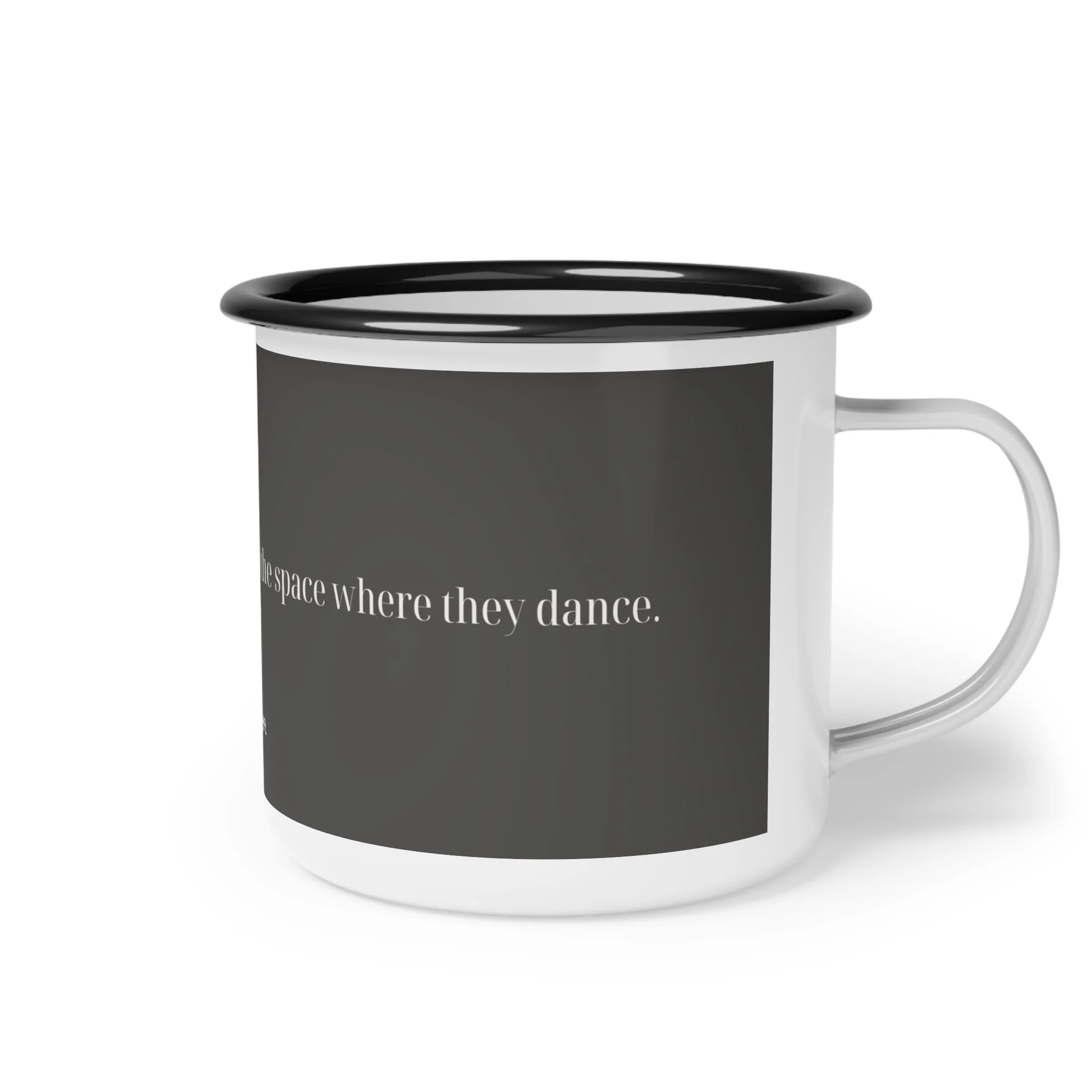 This enamel camp cup brings a quiet, meditative energy to your morning brew. The deep, charcoal wraparound background and subtle white type feel like a whispered line from a poem — steady, contemplative, and oddly reassuring. It sits well on a scratched picnic table, in the passenger cupholder on a foggy drive, or on the windowsill where you watch rain on the panes. The glossy enamel finish catches light just enough to show its character without shouting. Lightweight and resilient, it travels easily to trailheads, writers’ retreats, and small cabin porches where long, slow sips are part of the ritual. Keep it with the people who savor stillness and plain truth.